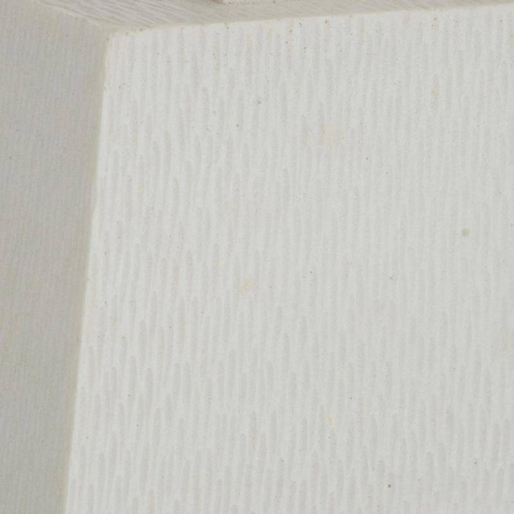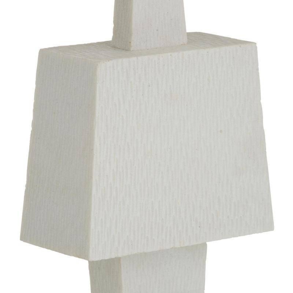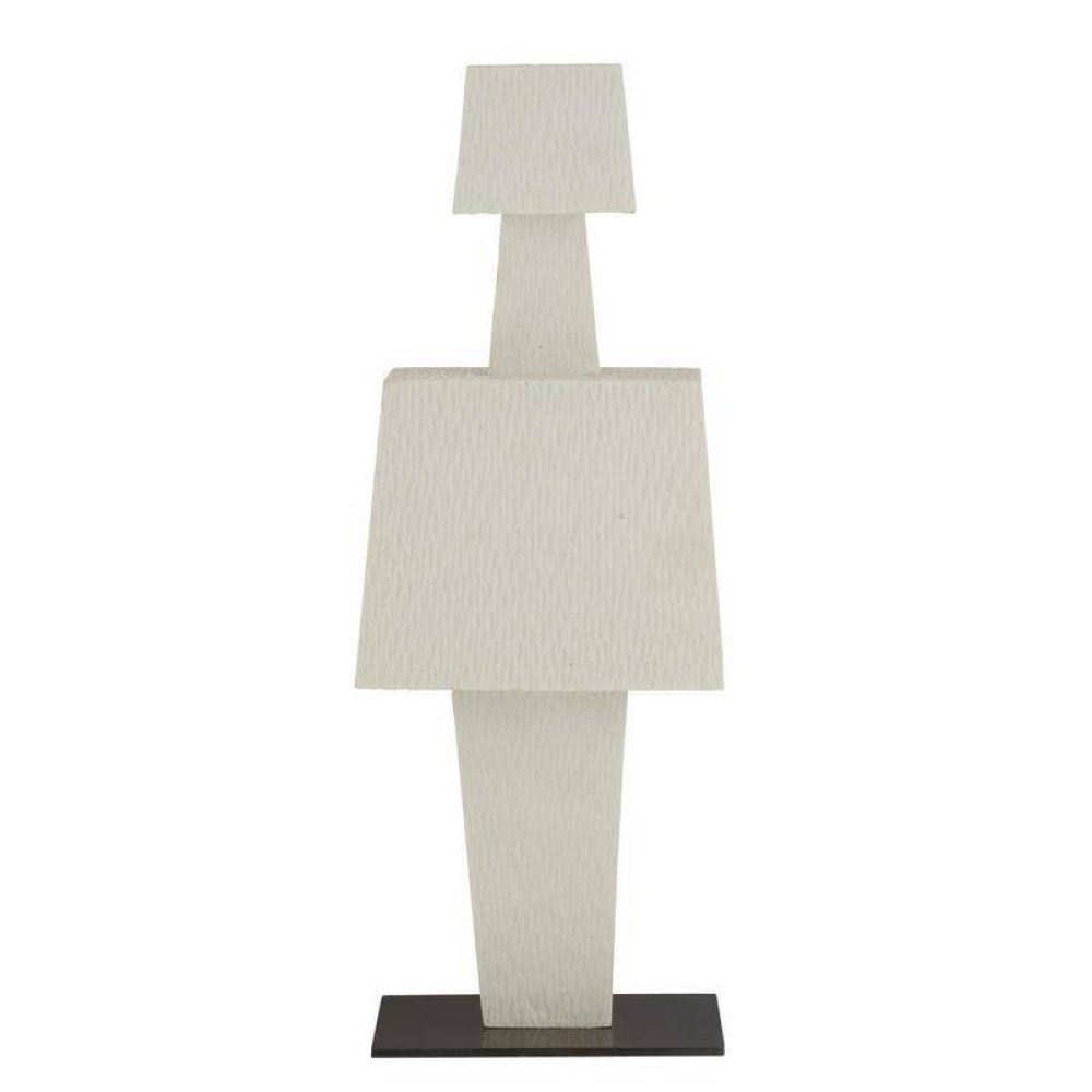 Ancient totemic forms inspired a modernist sculpture of chiseled ivory riverstone composite. Each shape combines to create a human-like figure anchored to a bronze steel base.
