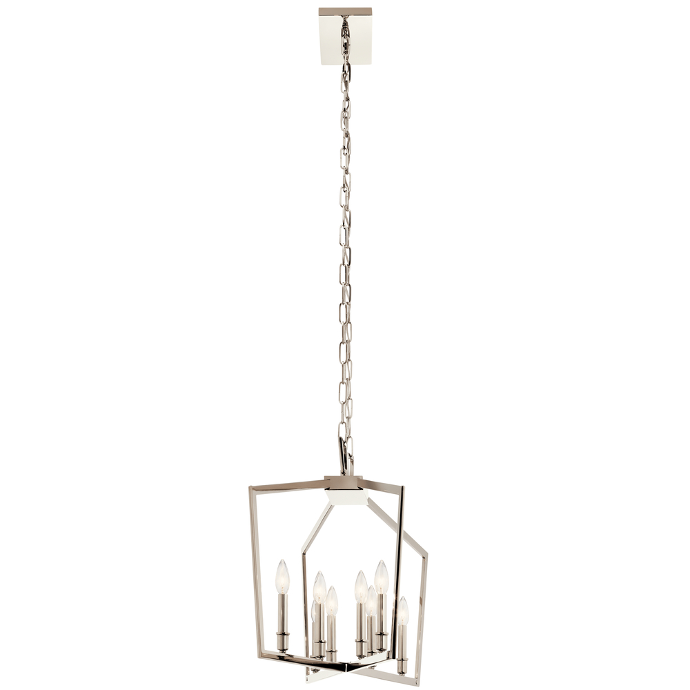 The open cage style of Abbotswell linear chandelier makes maximum impact with minimal lines. Intersecting pentagons in a cool Polished Nickel finish create a look that works in a variety of decors: updated traditional, transitional or modern farmhouse.